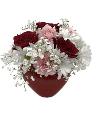 Adorable mix of daisies, roses, carnations and babies breath in a red ceramic heart vase